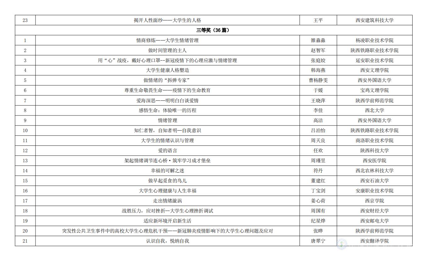 陕西机电职业技术学院参加陕西省委教育工委举办的第五届“阳光护航”心理育人宣传季实践系列活动,在第二届心理健康教育优秀教案评选活动中我校教师张玉琼所作题目为《触摸心灵打开人际关系的大门》的教案获得了二等奖、张军霞所作题目为《控制情绪做情绪的管理者》的教案获得了三等奖。